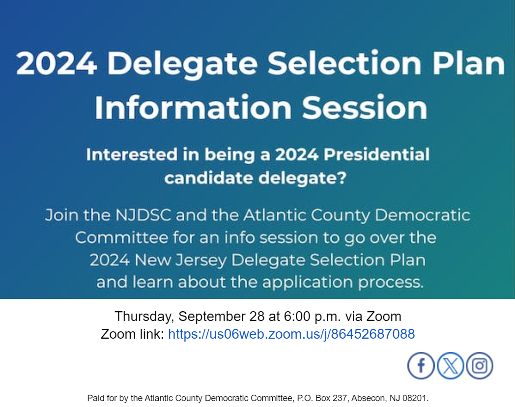 Please join the New Jersey Democratic State Committee and learn about the 2024 DNC Convention Delegate Selection Plan. The 2024 DNC Convention will take place in Chicago from August 19th, 2024 - August 22nd, 2024. The Delegate Selection Plan lays out the rules and procedures for the allocation and election of delegates to serve under the New Jersey Delegation. The informational session is your opportunity to ask questions about the application process and learn how you can represent Atlantic County and New Jersey.