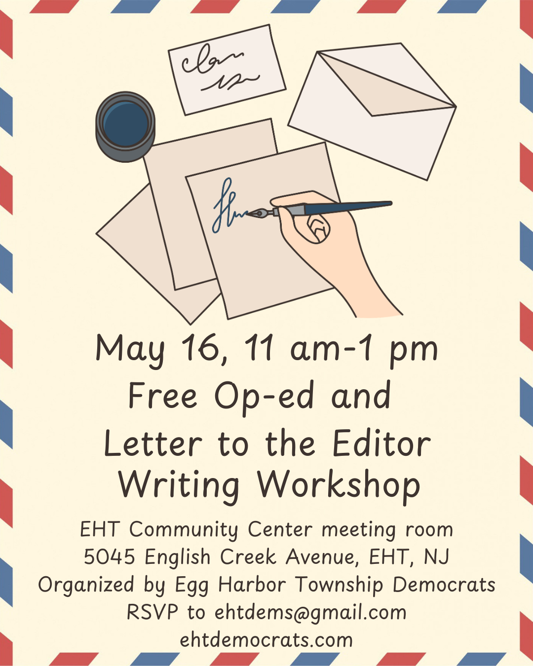 RSVP to ehtdems@gmail.com recommended and requested. Include full name and town and (optional) topics you’d like to write about.