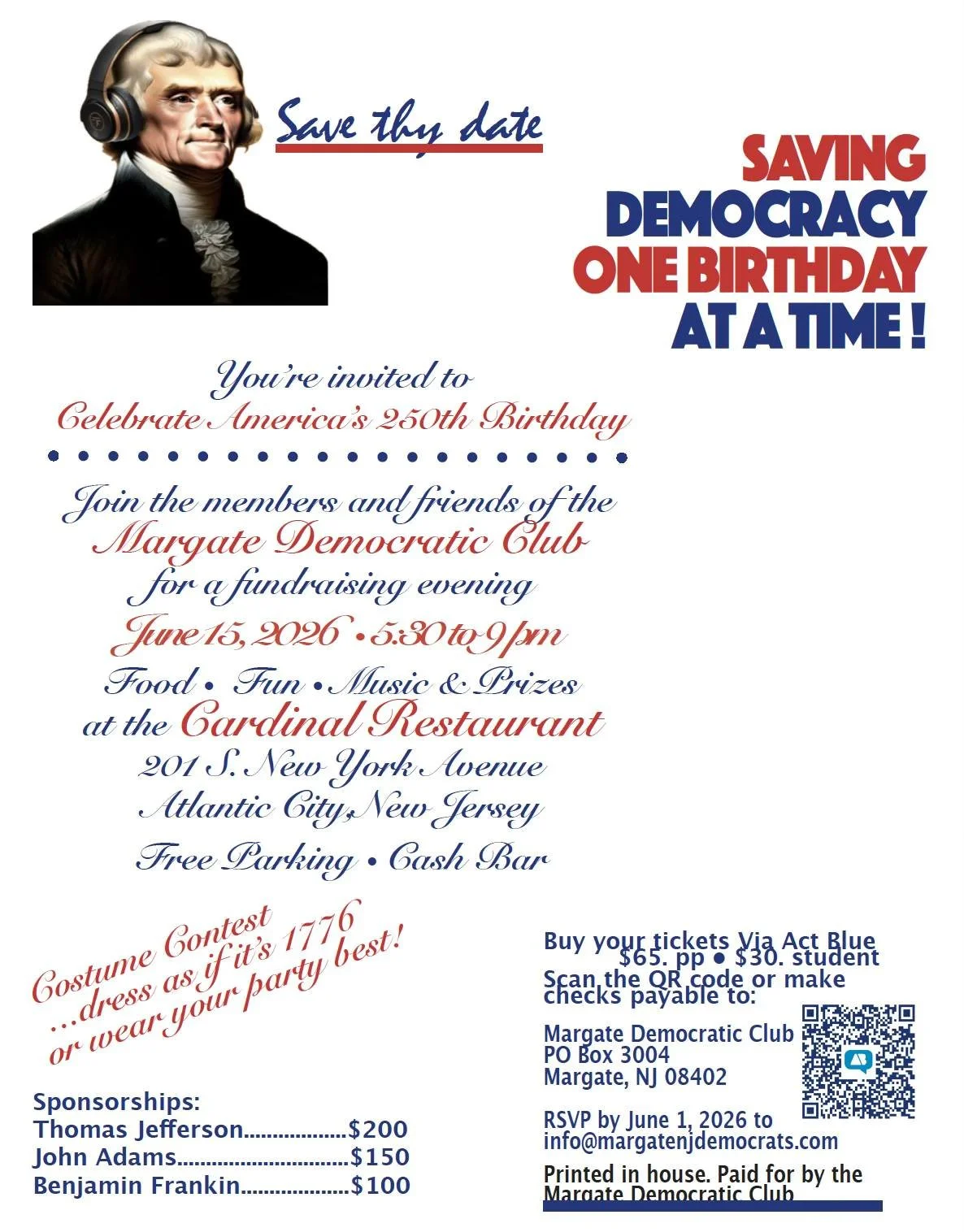 The Margate Democratic Club invites you to celebrate America's 260th Birthday at a fundraising evening at the Cardinal Restaurant in Atlantic City on June 15th. Join us for good food, good memories, enjoyable music, and some fun prizes!